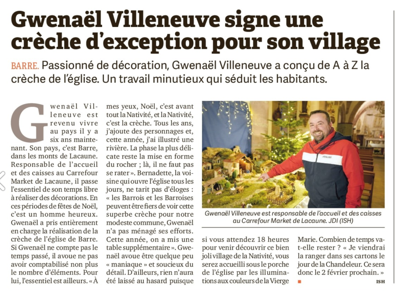 Comme chaque année à l’occasion des fêtes de Noël, nous vous invitons à venir découvrir notre superbe crèche, réalisée cette fois-ci par Gwenaël, habitant de la commune, que nous remercions chaleureusement pour son investissement et son talent !